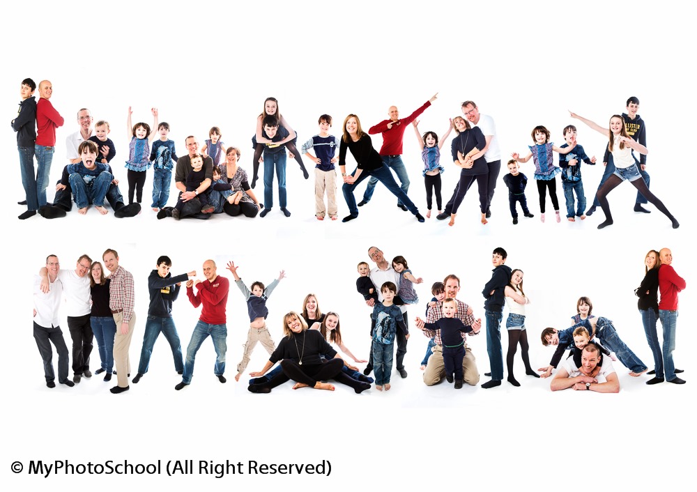 My solution was to take small family groups and then merge them all together in Photoshop. To do this, all you need a white seamless paper background and at least 2 TTL flash guns or three or four studio lights.