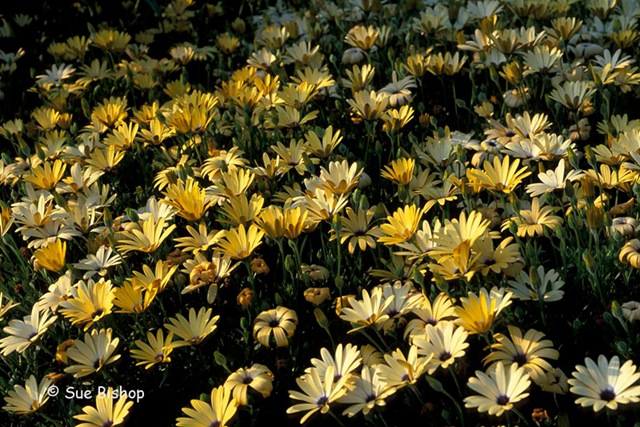 There are lots of things wrong with the photo of yellow osteospermums (above) taken from standing height. The bright overhead sunlight is not helping, and some of the flowers look overlit, while the ground beneath them has gone almost black. Also, from this distance a lot of flowers are included in the frame, many of which have gone past their best.